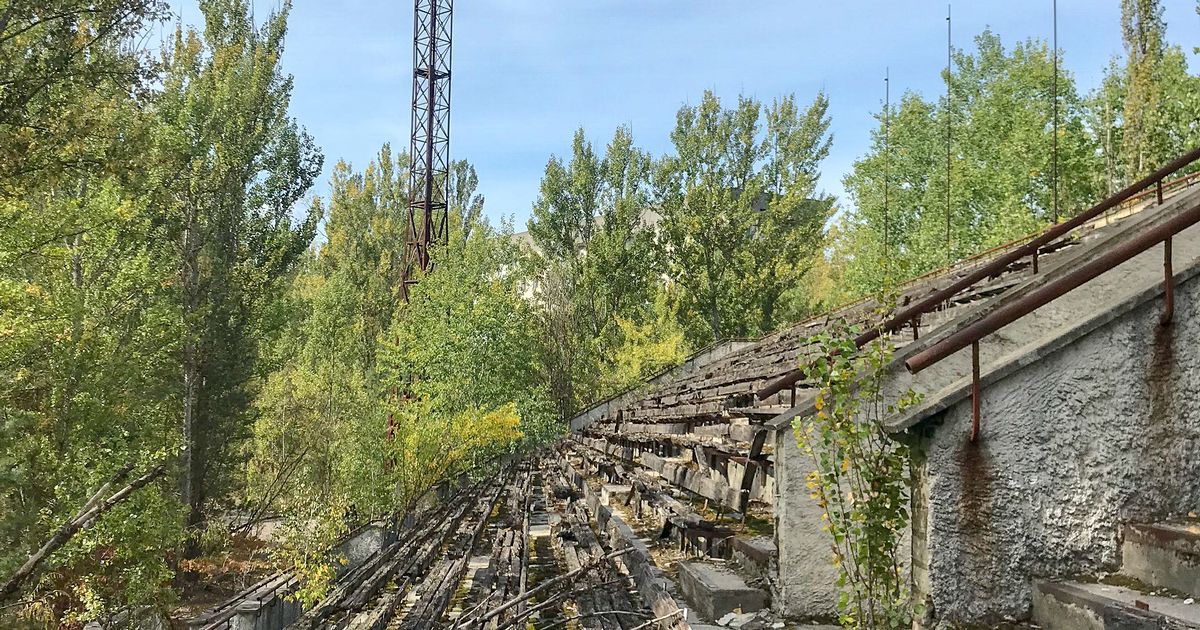 The stadium was once the home ground of Soviet club FC Stroitel Pripyat, a fourth-tier team established in the 1970s. Pripyat was created to serve the nearby Chernobyl Nuclear Power Plant. The stadium was constructed in 1979, with the club’s players donning black and green jerseys on the pitch.