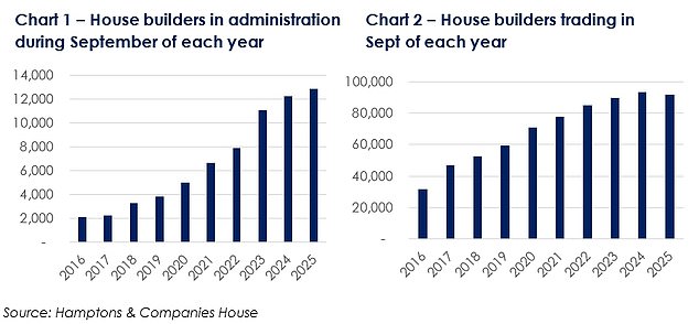 As of September this year, 12,904 housebuilders were either in administration or in the process of being wound up, according to analysis of Companies House data by estate agent Hamptons.