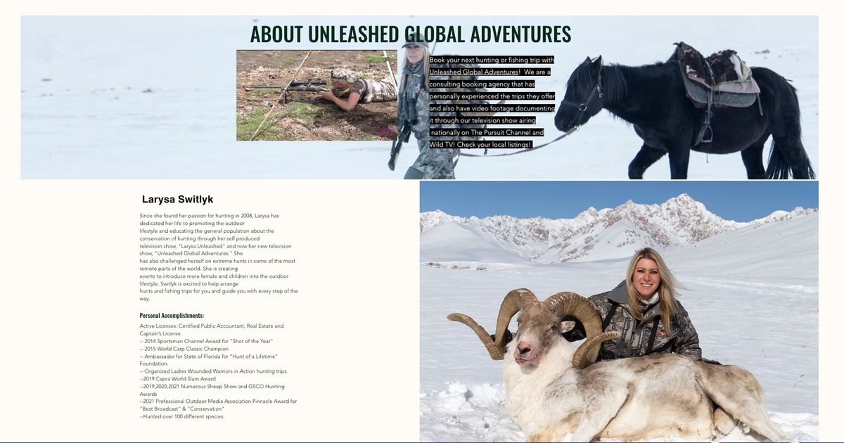 Switlyk’s company advertises hunts around the world and her website shows pictures of her posing with a dead white rhino, crocodiles, wild birds, antelopes.