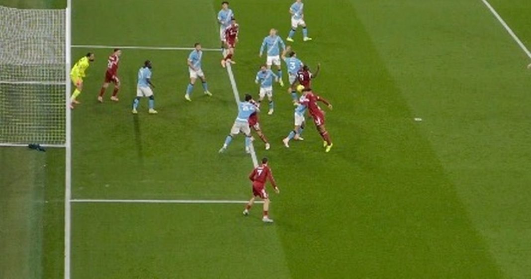 “We know the corner comes in and the ball reaches Van Dijk, and as the corner comes across the penalty area the Manchester City players move out and they leave Robertson offside.